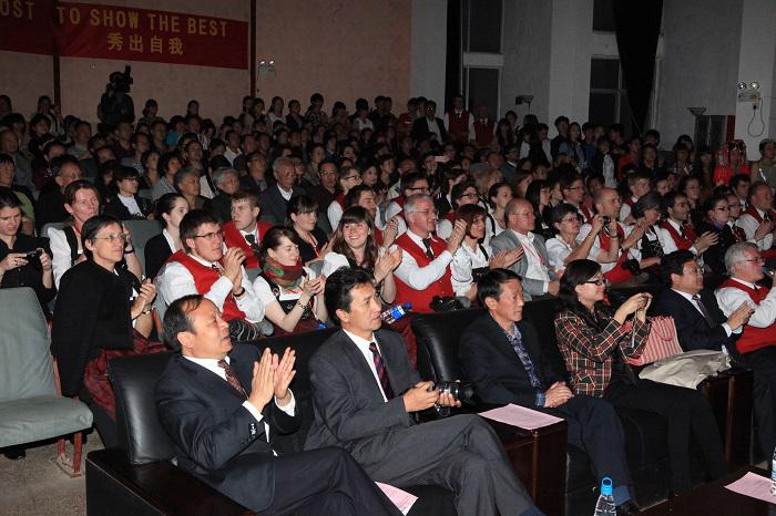 音乐会在我院音乐系师生演奏的古筝合奏《草原英雄小姐妹》中拉开帷幕,随后,催人泪下的二胡名曲《二泉映月》、沉雄悲壮的琵琶曲《霸王卸甲》、富有民族气息的女声独唱《巴颜喀拉》、欢快动听的竹笛演奏等精彩节目逐一亮相舞台,获得了在场中外观众的阵阵掌声。当德国慕尼黑Eichenau管乐团演奏的安东尼德沃夏克的《第九交响曲》,小约翰施特劳斯的《皇帝圆舞曲》,居塞比威尔第的《歌剧序曲》和贝多芬的《欢乐颂》等耳熟能详的经典曲目在音乐会上空响起时,现场顿时沸腾了。Eichenau乐团还穿上德国巴伐利亚地区的民族盛装,演奏了《米老鼠进行曲》让我们仿佛回到童年时代。《巴伐利亚传统军乐》威武庄严,让人听了肃然起敬。《快乐的自行车骑者》带给我们的是一个清新贴近自然的感觉。乐团艺术家们在展现他们娴熟演奏技巧和管乐独特魅力的同时,也生动诠释了乐曲的丰富内涵。一首首令人激动的乐曲,把现场气氛一次又一次推向高潮,为我校师生呈现了一场精妙绝伦的视听盛宴。